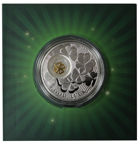 В центральной части реверса серебряной монеты находятся рельефные изображения листиков клевера. Вверху расположена вставленная в монету прозрачная капсула с серебряным элементом в форме четырехлистного клевера. Внизу с левой стороны, вдоль края реверса, расположена надпись – GOOD LUCK