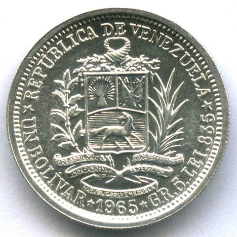 1 боливар 1965 г. Венесуэла XF-AU Серебро