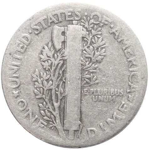 Реверс: Изображены: пучок фасций, клинок топора и 2 оливковые ветви. Надписи: E • PLURIBUS UNUM / UNITED • STATES • OF • AMERICA / * ONE DIME *.