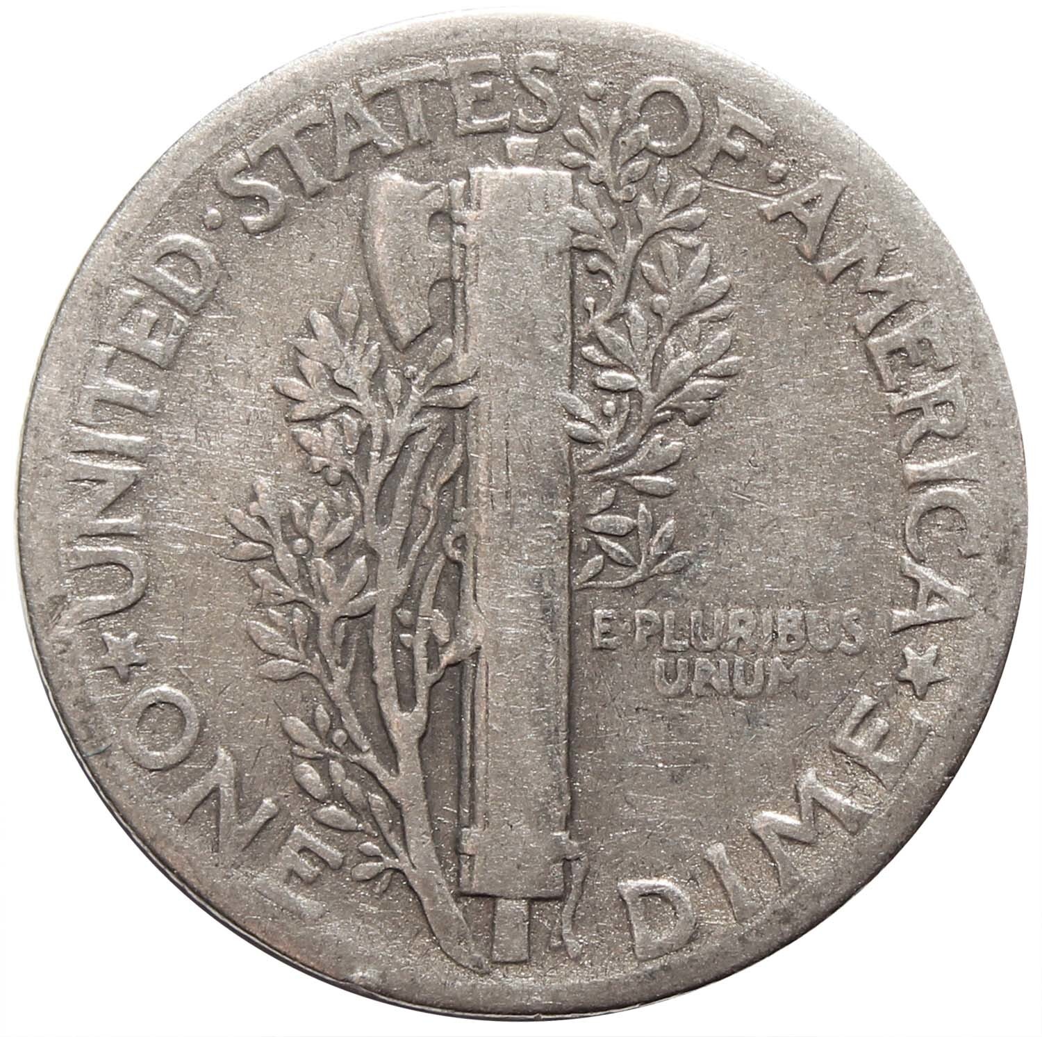 Реверс: Изображены: пучок фасций, клинок топора и 2 оливковые ветви. Надписи: E • PLURIBUS UNUM / UNITED • STATES • OF • AMERICA / * ONE DIME *.