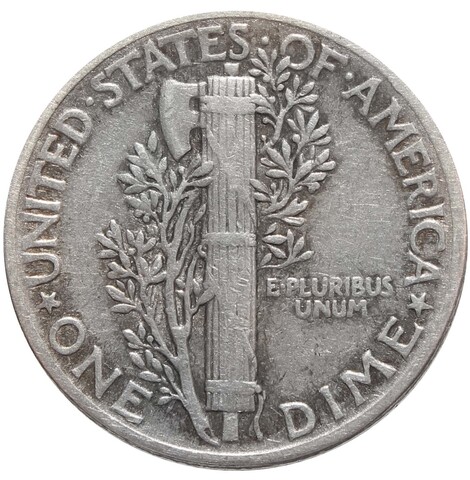 Реверс: Изображены: пучок фасций, клинок топора и 2 оливковые ветви. Надписи: E • PLURIBUS UNUM / UNITED • STATES • OF • AMERICA / * ONE DIME *.