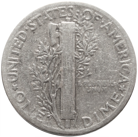 Реверс: Изображены: пучок фасций, клинок топора и 2 оливковые ветви. Надписи: E • PLURIBUS UNUM / UNITED • STATES • OF • AMERICA / * ONE DIME *.