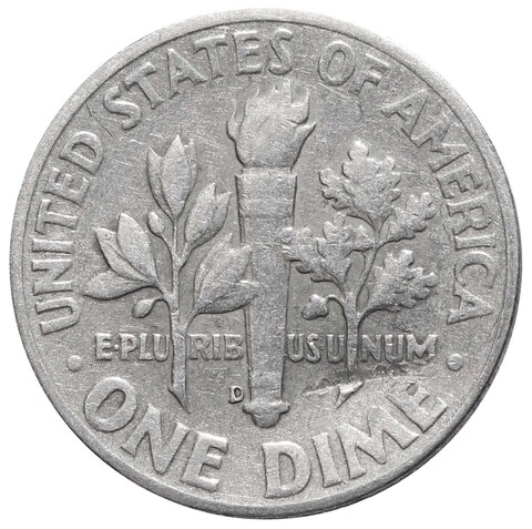 Реверс: В центре изображены: оливковая ветвь, факел и дубовая ветвь, символизирующие соответственно: мир, свободу и победу. Надписи: E • PLU RIB US • U NUM / UNITED STATES OF AMERICA / • ONE DIME •.