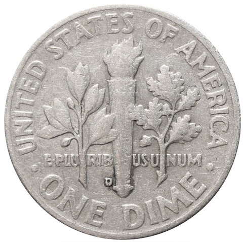 Реверс: В центре изображены: оливковая ветвь, факел и дубовая ветвь, символизирующие соответственно: мир, свободу и победу. Надписи: E • PLU RIB US • U NUM / UNITED STATES OF AMERICA / • ONE DIME •.