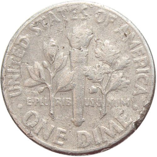 Реверс: В центре изображены: оливковая ветвь, факел и дубовая ветвь, символизирующие соответственно: мир, свободу и победу. Надписи: E • PLU RIB US • U NUM / UNITED STATES OF AMERICA / • ONE DIME •.