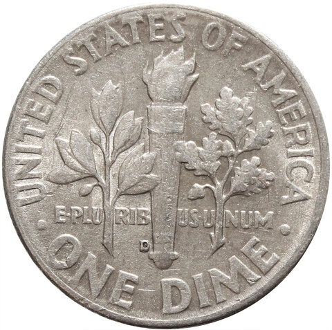 Реверс: В центре изображены: оливковая ветвь, факел и дубовая ветвь, символизирующие соответственно: мир, свободу и победу. Надписи: E • PLU RIB US • U NUM / UNITED STATES OF AMERICA / • ONE DIME •.