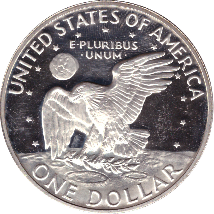 Реверс: Орёл над поверхностью Луны - символизирует высадку американцев на Луне. Надписи: UNITED STATES OF AMERICA / E PLURIBUS UNUM / ONE DOLLAR.