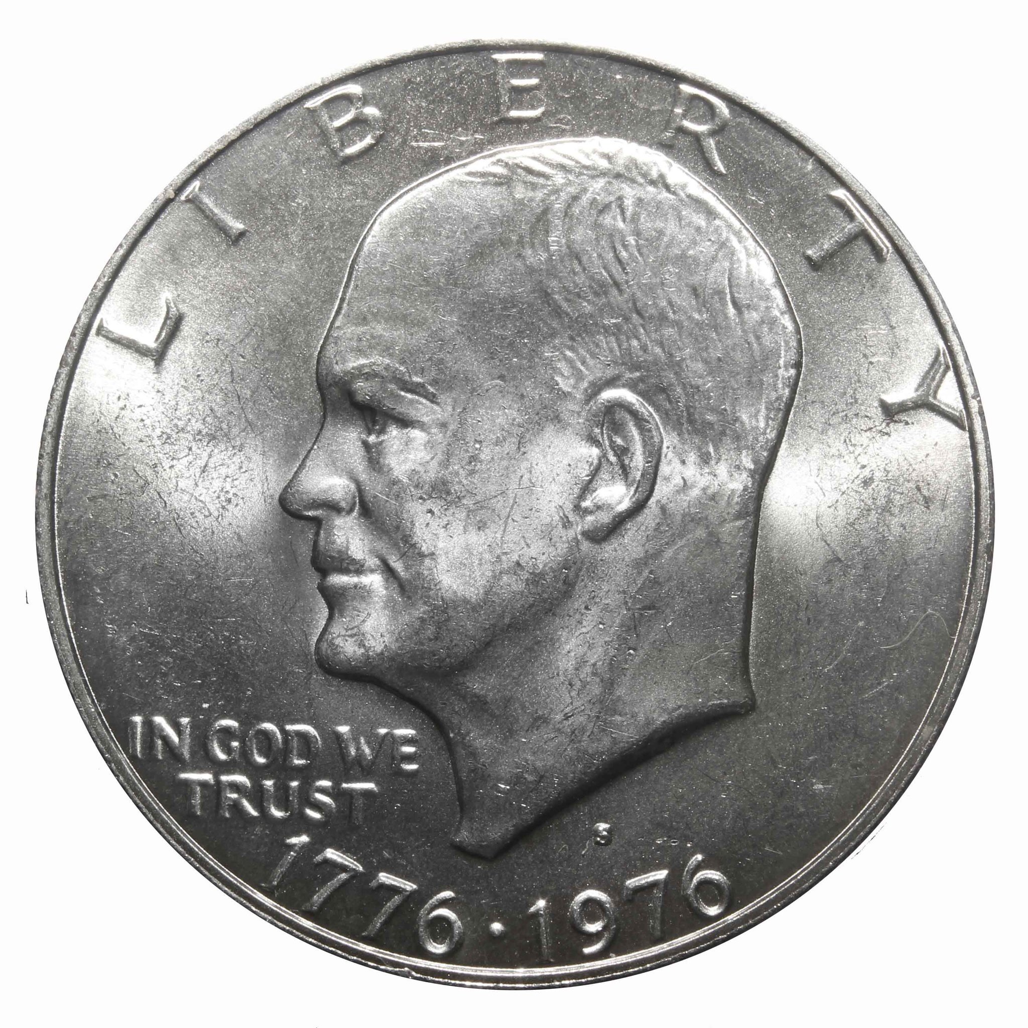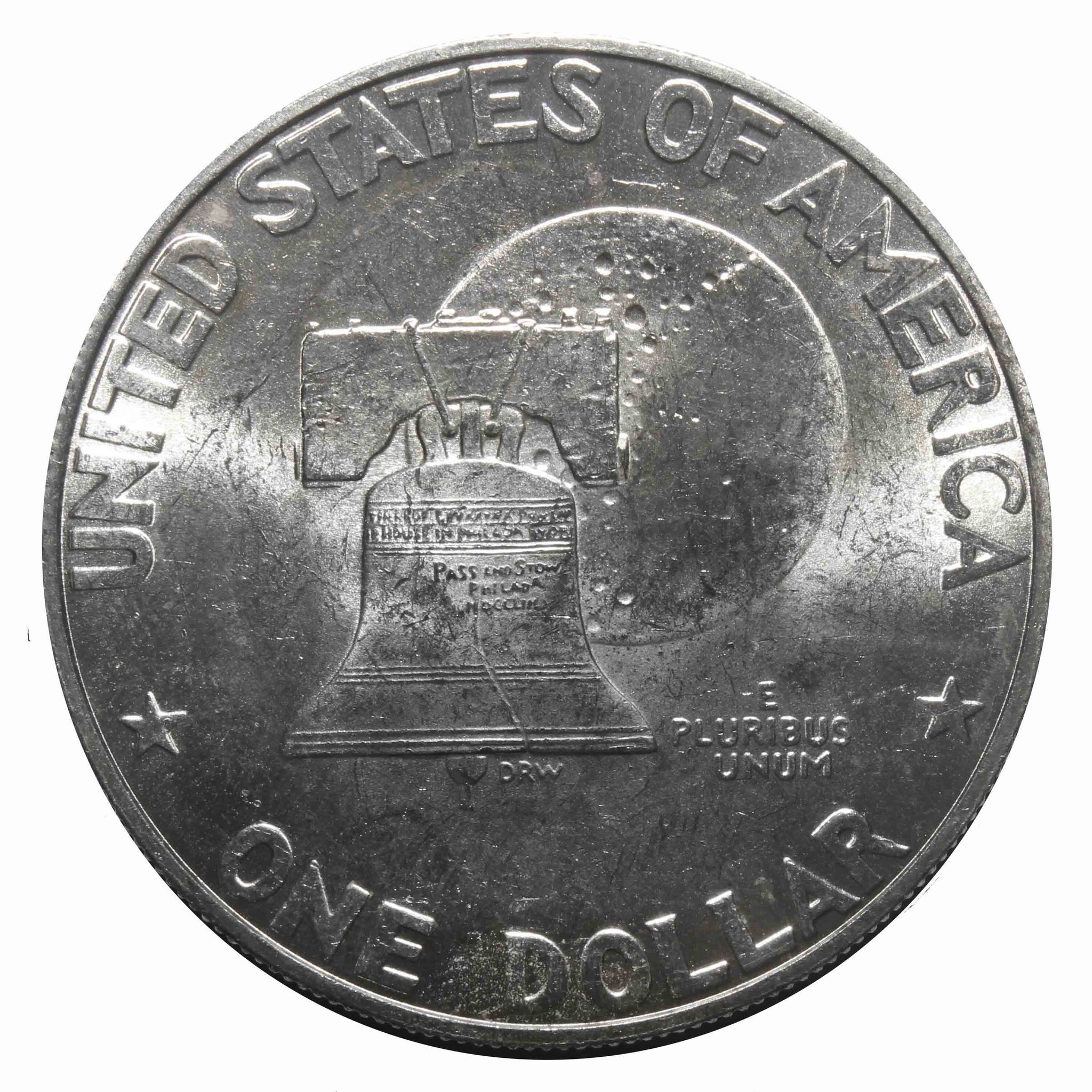 Доллар США, выпущенный к 200-летию Декларации независимости Соединенных Штатов. Изображены Колокол Свободы и Луна, где побывали американские астронавты, на другой стороне - президент Дуайт Эйзенхауэр.