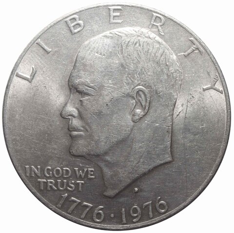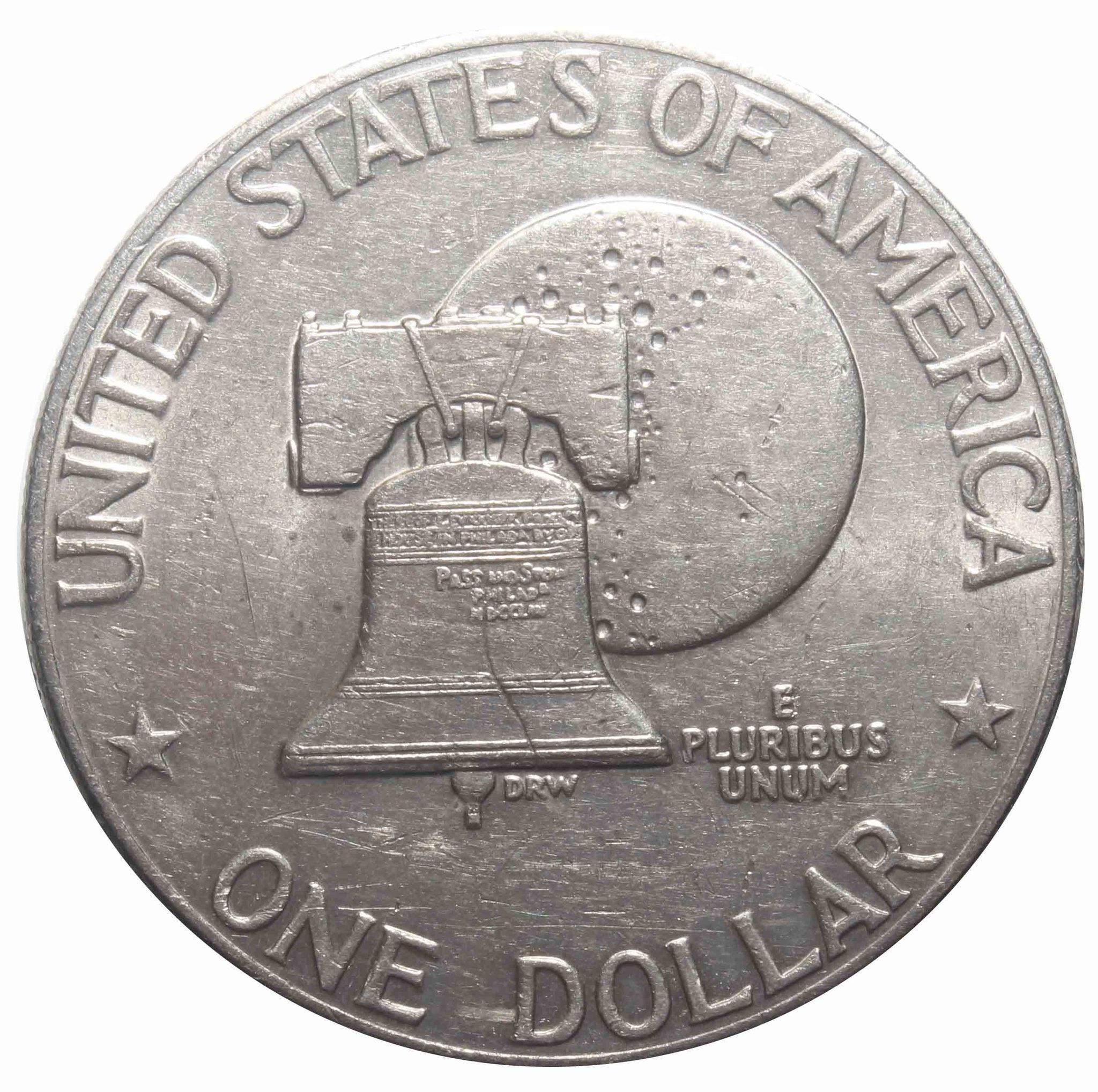 Доллар США, выпущенный к 200-летию Декларации независимости Соединенных Штатов. Изображены Колокол Свободы и Луна, где побывали американские астронавты, на другой стороне - президент Дуайт Эйзенхауэр.