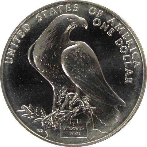 Реверс: Изображён Американский орёл, сидящий на камне. На камне надпись: "E PLURIBUS UNUM". Сверху полукругом надписи в две строки: "UNITED STATES OF AMERICA" и "ONE DOLLAR".