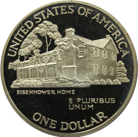 Реверс: Национальный исторический музей Эйзенхауэра в Геттисберге. Надписи: UNITED STATES OF AMERICA / EISENHOWER HOME / E PLURIBUS UNUM / ONE DOLLAR / CYM.