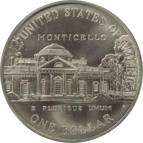Реверс: Усадьба Томаса Джефферсона - Монтичелло. Вверху монеты - надписи: "UNITED STATES OF AMERICA" и "MONTICELLO", снизу: "E PLURIBUS UNUM" и "ONE DOLLAR".
