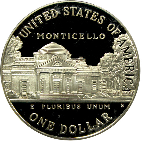 Реверс: Усадьба Томаса Джефферсона - Монтичелло. Вверху монеты - надписи: "UNITED STATES OF AMERICA" и "MONTICELLO", снизу: "E PLURIBUS UNUM" и "ONE DOLLAR".