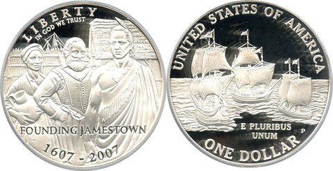 Аверс: На монете изображены три человека, представляющие различные культуры первых поселенцев Джеймстауна. Надписи: “Liberty”, “In God We Trust”, “Founding Jamestown” и дата “1607 – 2007″.