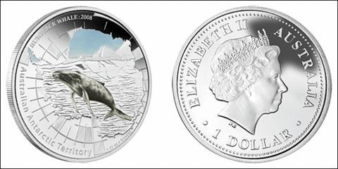 1 доллар 2008 год. Горбатый кит. Австралийские антарктические территории. Австралия. Серебро