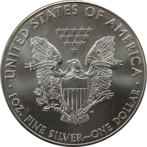 Реверс: В центре расположено несколько модифицированное изображение большой печати США с полукруговыми надписями «UNITED STATES OF AMERICA» и «1 OZ. FINE SILVER — ONE DOLLAR».