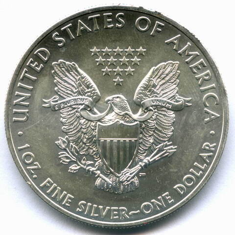 Реверс: В центре расположено несколько модифицированное изображение большой печати США с полукруговыми надписями «UNITED STATES OF AMERICA» и «1 OZ. FINE SILVER — ONE DOLLAR».