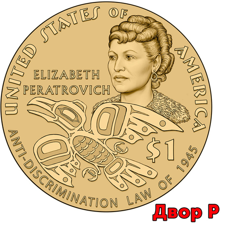 Дизайн представляет собой изображение рельефного портрета Елизаветы Ператрович в верхнем правом углу. На переднем плане крупным планом отчеканен Ворон Тлингит - символ американского индийского народа Юго-восточной Аляски. Надписи «UNITED STATES of AMERICA», «ELIZABETH PERATROVICH», «$1» и «ANTI-DISCRIMINATION LAW of 1945» дополняют дизайн художника монетного двора США Фиби Хемфилла.