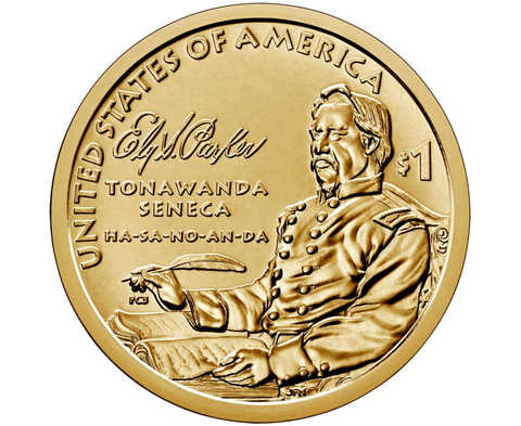 На реверсе изображен Паркер, в армейской форме, с гусиным пером и книгой, а также изображение его подписи, как символы его опыта в качестве эксперта-коммуникатора. Надписи TONAWANDA SENECA и HA-SA-NO-AN-DA признают его племя и имя, данное ему при рождении. Дополнительные надписи включают СОЕДИНЕННЫЕ ШТАТЫ АМЕРИКИ и 1 доллар США.