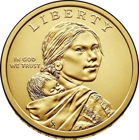 На аверсе монеты по-прежнему будет изображена центральная фигура Сакагавея, несущая своего маленького сына, Жана Батиста, скульптора Гленны Гудакр. Надписи “СВОБОДА” и “В БОГА МЫ ВЕРИМ”.
