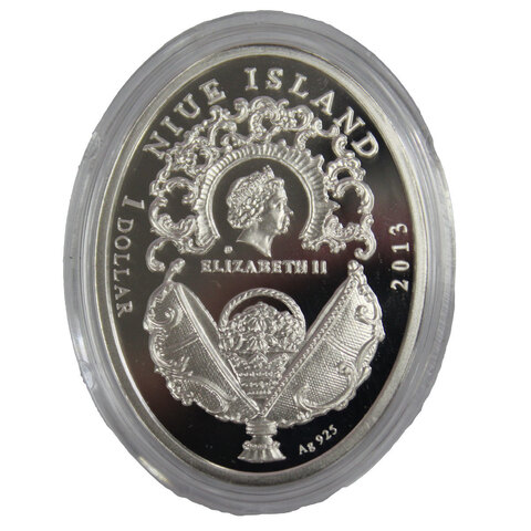 Реверс: Внизу - стилизованное изображение открытого яйца «Весенние цветы» с миниатюрной корзиночкой с букетом анемонов. Над ним - портрет Её Величества Королевы Елизаветы II и надпись «ELIZABETH II» (Елизаветы II), под портретом фирменный знак монетного двора (m/w). Вокруг головы королевы - декоративный орнамент в стиле неорококо. Вверху - NIUE ISLAND (Остров Ниуэ). С левой стороны - номинал: 1 DOLLAR (1 доллар). С правой - год выпуска: 2013. В самом низу - Ag 925 (серебро 925 пробы).