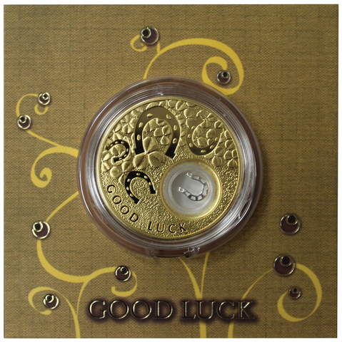 Монетный диск имеет отверстие, в которое вставлена прозрачная капсула с находящимся внутри дополнительным элементом монеты - подковкой (символом удачи и счастья), выполненной из серебра, массой 0.92 г.