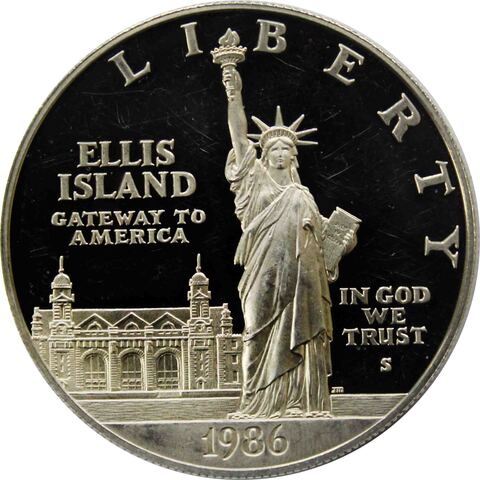 Аверс: Статуя Свободы на фоне иммиграционного центра, расположенного на острове Эллис. Сверху полукругом надпись: "LIBERTY". С правой стороны надпись: "IN GOD WE TRUST"/ Cлева надписи: "ELLIS ISLAND" и "GATE WAY TO AMERICA" и снизу расположен год выпуск монеты.