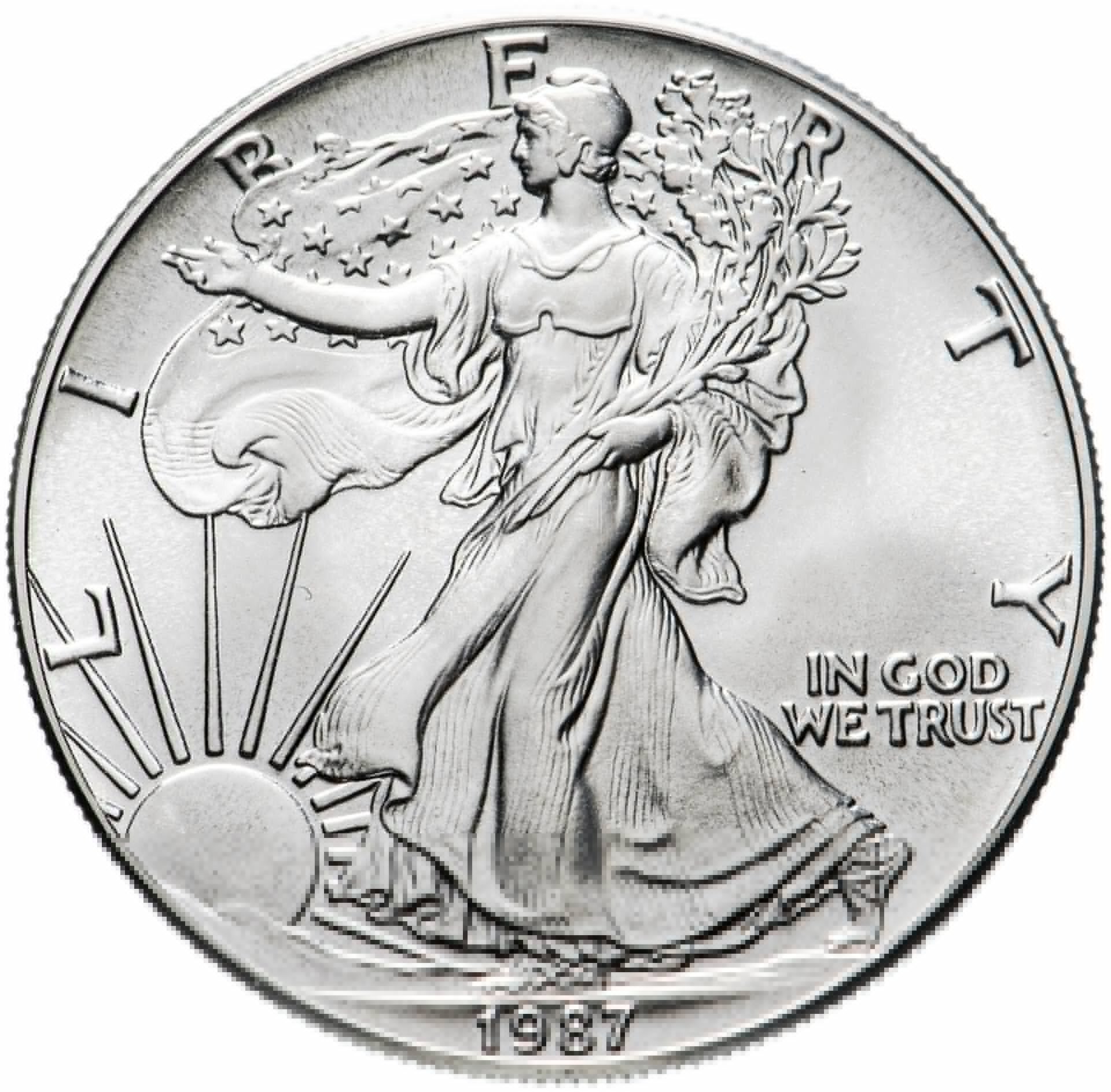 Реверс: В центре расположено несколько модифицированное изображение большой печати США с полукруговыми надписями «UNITED STATES OF AMERICA» и «1 OZ. FINE SILVER — ONE DOLLAR».