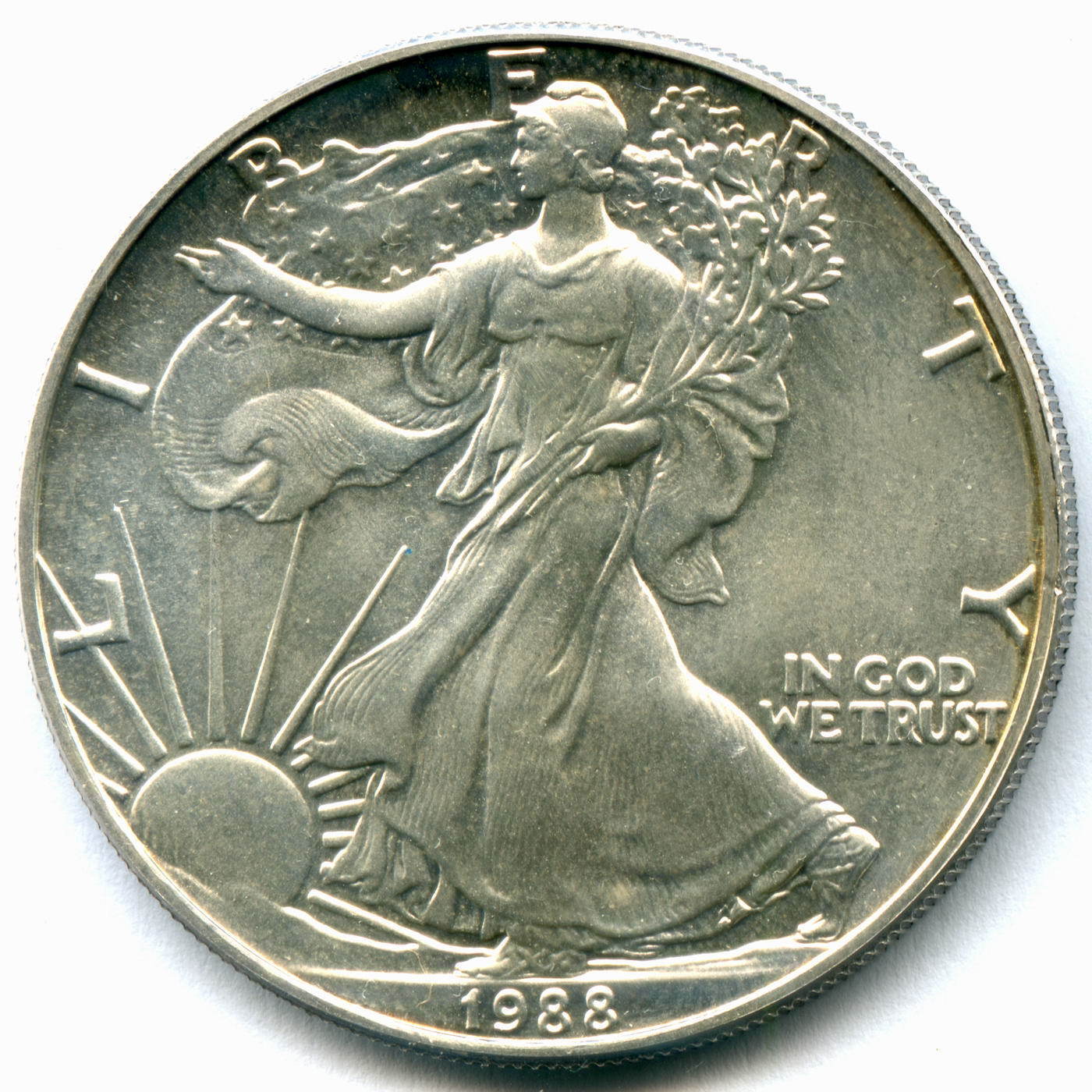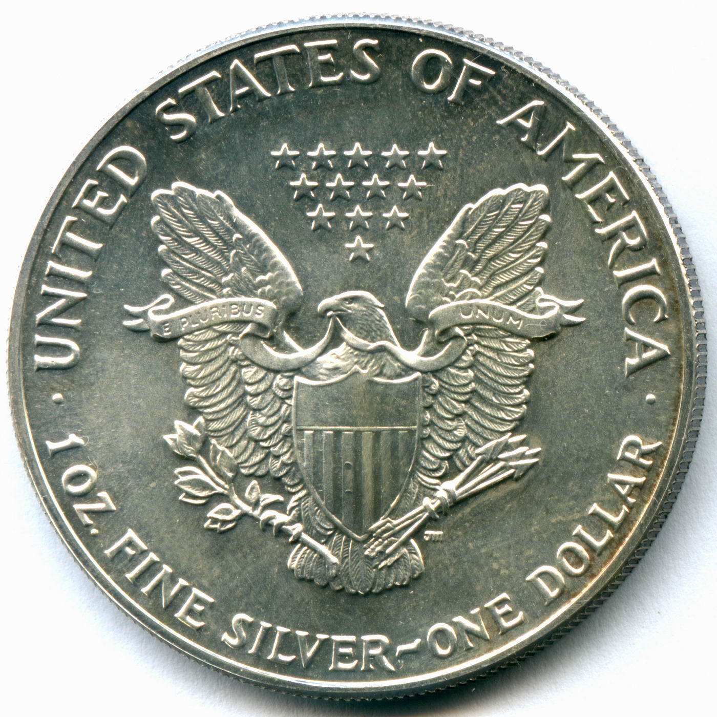 Реверс: В центре расположено несколько модифицированное изображение большой печати США с полукруговыми надписями «UNITED STATES OF AMERICA» и «1 OZ. FINE SILVER — ONE DOLLAR».
