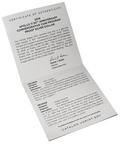 Монетный двор Соединенных Штатов 24 января 2019 года выпустил серию монет, все с одинаковым дизайном, в ознаменование 50-й годовщины пилотируемой космической миссии «Аполлон-11». Астронавты Армстронг и Олдрин были первыми людьми на Луне 20 июля 1969 года.
