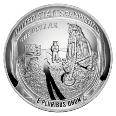 На реверсе монеты изображен крупный план знаменитой фотографии «Базз Олдрин на Луне», сделанной 20 июля 1969 года, на которой отражено то, что было отражено в забрале шлема космонавта Базза Олдрина - астронавта Нила Армстронга, флаг США и лунный модуль «Орел» и тень Базза Олдрина, когда он делал этот снимок. Надписи: «СОЕДИНЕННЫЕ ШТАТЫ АМЕРИКИ», номинал и «E PLURIBUS UNUM» (из многих одна).