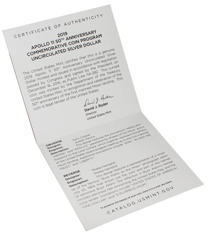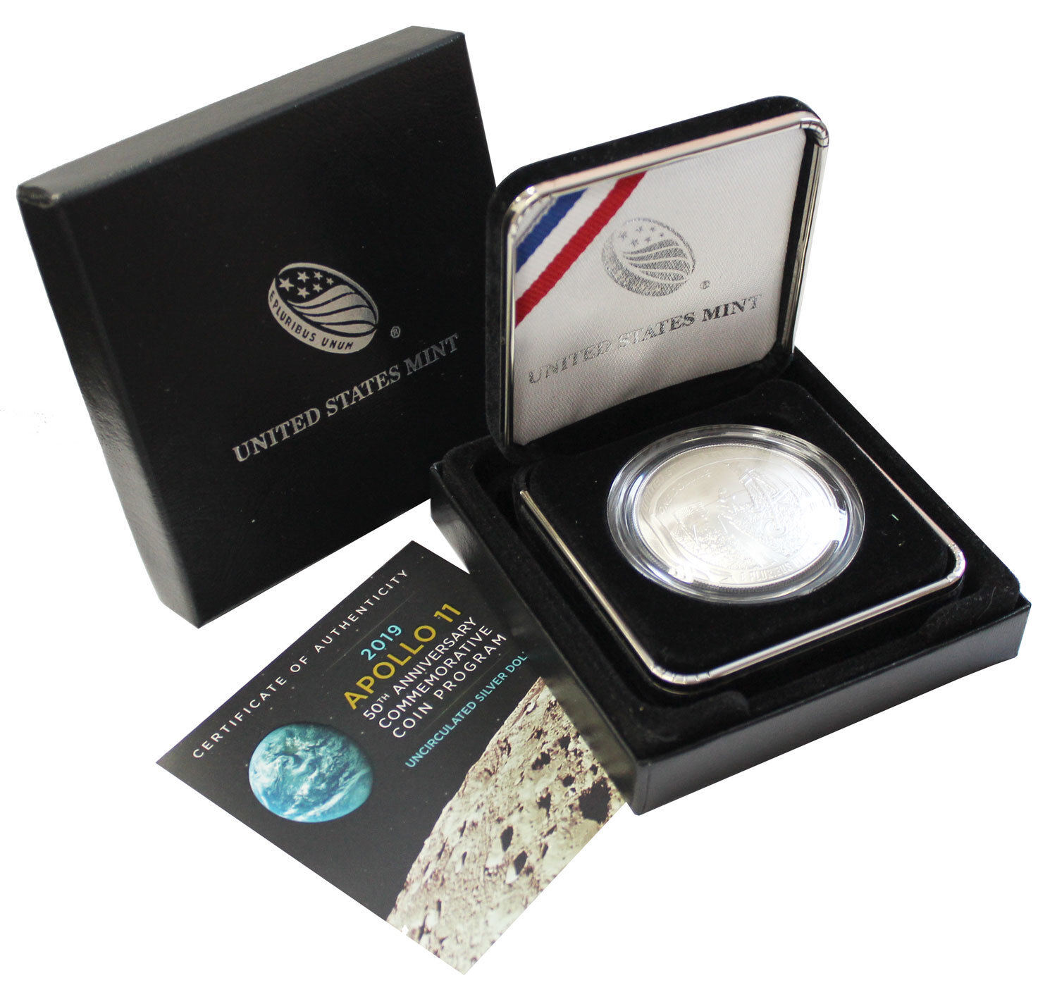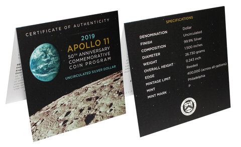 Монетный двор Соединенных Штатов 24 января 2019 года выпустил серию монет, все с одинаковым дизайном, в ознаменование 50-й годовщины пилотируемой космической миссии «Аполлон-11». Астронавты Армстронг и Олдрин были первыми людьми на Луне 20 июля 1969 года.