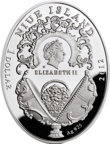 Реверс: Внизу - стилизованное изображение открытого яйца «Весенние цветы» с миниатюрной корзиночкой с букетом анемонов. Над ним - портрет Её Величества Королевы Елизаветы II и надпись «ELIZABETH II» (Елизаветы II), под портретом фирменный знак монетного двора (m/w). Вокруг головы королевы - декоративный орнамент в стиле неорококо. Вверху - NIUE ISLAND (Остров Ниуэ). С левой стороны - номинал: 1 DOLLAR (1 доллар). С правой - год выпуска: 2012. В самом низу - Ag 925 (серебро 925 пробы).