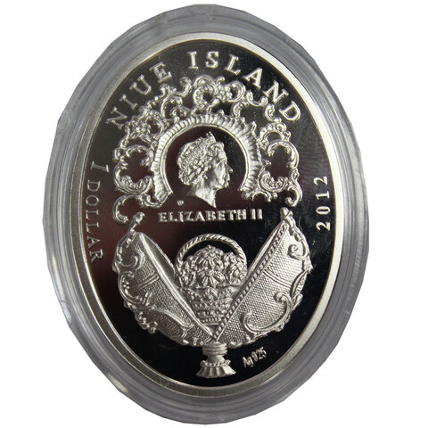 Реверс: Внизу - стилизованное изображение открытого яйца «Весенние цветы» с миниатюрной корзиночкой с букетом анемонов. Над ним - портрет Её Величества Королевы Елизаветы II и надпись «ELIZABETH II» (Елизаветы II), под портретом фирменный знак монетного двора (m/w). Вокруг головы королевы - декоративный орнамент в стиле неорококо. Вверху - NIUE ISLAND (Остров Ниуэ). С левой стороны - номинал: 1 DOLLAR (1 доллар). С правой - год выпуска: 2012. В самом низу - Ag 925 (серебро 925 пробы).