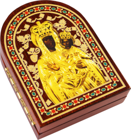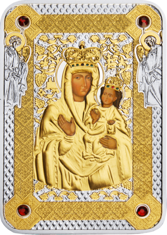 Аверс: В центре - цветное позолоченное изображение Зарваницкой иконы Божией Матери на фоне позолоченного орнамента. Икона расположено в позолоченной фигурной рамке по углам которой инкрустированы бордовые кристаллы Swarowski. Справа и слева от изображения иконы - ангелы с позолоченными нимбами и крыльями.