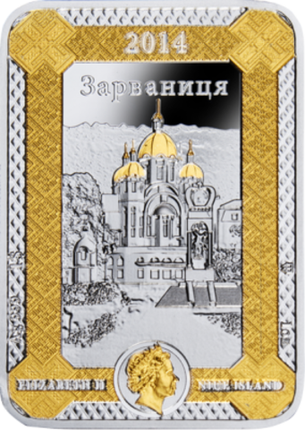 Реверс: В центральной части монеты - рельефное изображение храмового комплекса Зарваница с Собором Зарваницкой Божьей Матери в Тернопольской области Украина с позолоченными купалами. Комплекс расположен позолоченной фигурной рамке. Над изображением комплекса надписи: его название ЗАРВАНИЦЯ и год выпуска монеты 2014. Снизу на фигурной рамке позолоченное изображение портрета Ее Величества Королевы Елизаветы II. Справа и слева от портрета надписи: ELIZABETH II (Елизавета II) и NIUE ISLAND (Остров Ниуэ). Слева вдоль рамки - номинал монеты 1 $ (1 доллар) и характеристика металла Ag 999 (серебро 999 пробы). Слева - фирменный знак Монетного двора Польши (m/w) и вес монеты 1 oz (1 унция).