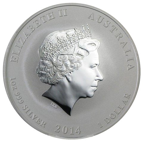 Аверс: В центре – рельефное изображение портрета Ее Величества Елизаветы II. По окружности надписи: ELIZABETH II (Елизавета II), AUSTRALIA (Австралия), номинал 1 DOLLAR (1 доллар), год выпуска 2014, 1 oz (1 унция = 31,10 гр.) и характеристика металла 999 SILVER (серебро 999 пробы).