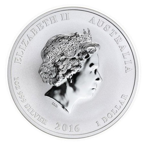 Аверс: В центре – рельефное изображение портрета Ее Величества Елизаветы II. По окружности надписи: ELIZABETH II (Елизавета II), AUSTRALIA (Австралия), номинал 1 DOLLAR (1 доллар), год выпуска 2016, 1 oz (1 унция = 31,10 гр.) и характеристика металла 999 SILVER (серебро 999 пробы).