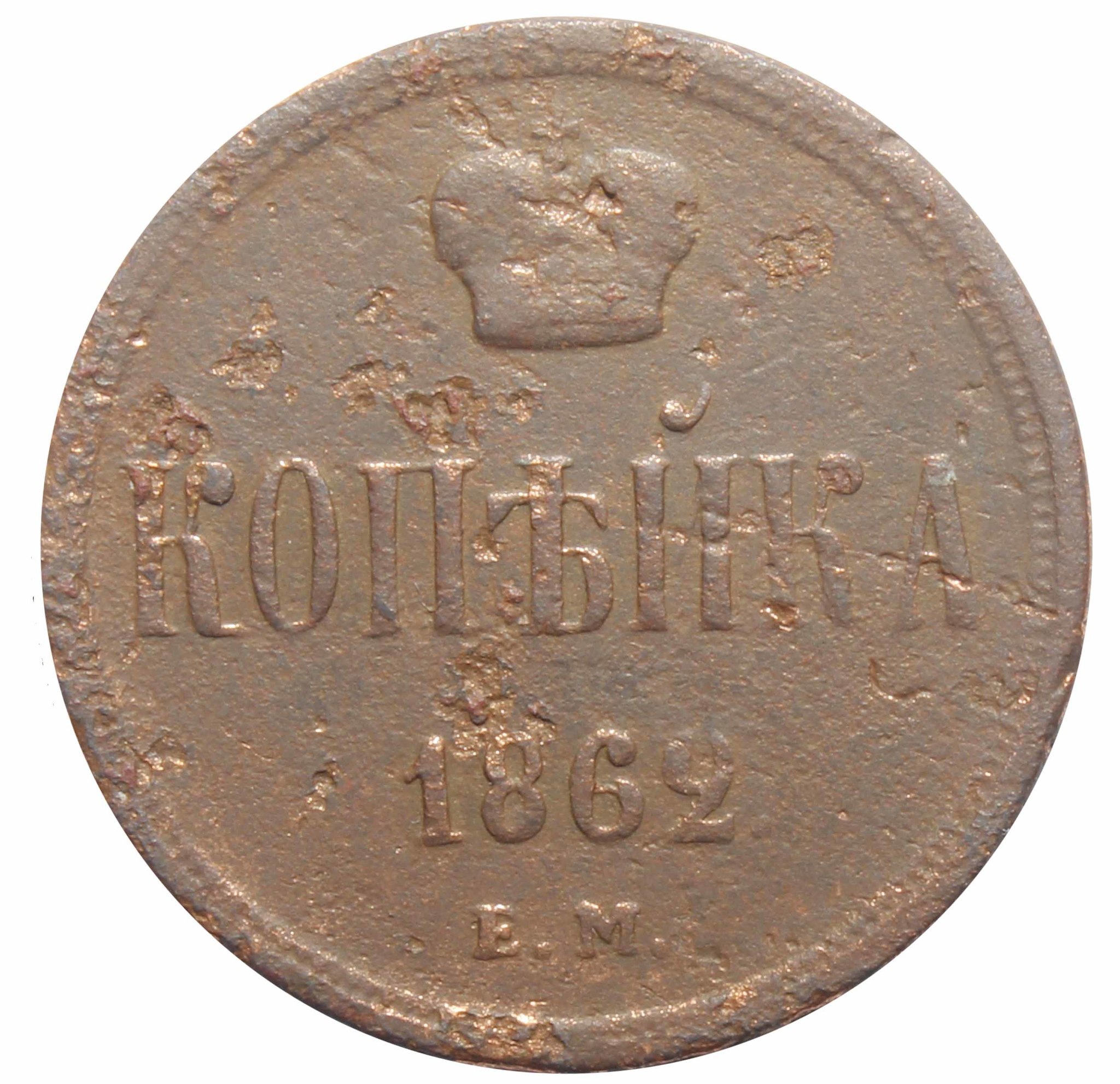 Реверс: вверху Большая Корона Российской империи, под ней обозначение номинала монеты слово «КОПЕЙКА», ниже год выпуска монеты «1862.» и под ним обозначение монетного двора буквы «ЕМ».
