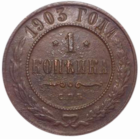 Реверс: вверху вдоль края монеты обозначение год выпуска «1903 ГОДА» ниже слева вдоль края монеты лавровая ветвь, справа дубовая, внизу ветви соединяются и перевязаны лентой, в середине в ободке из точек обрамленный слева и справа звездочками номинал монеты - цифра «1», ниже слово «КОПЕЙКА», под ним две направленные в разные стороны фигурные черты, ниже обозначение монетного двора «СПБ».