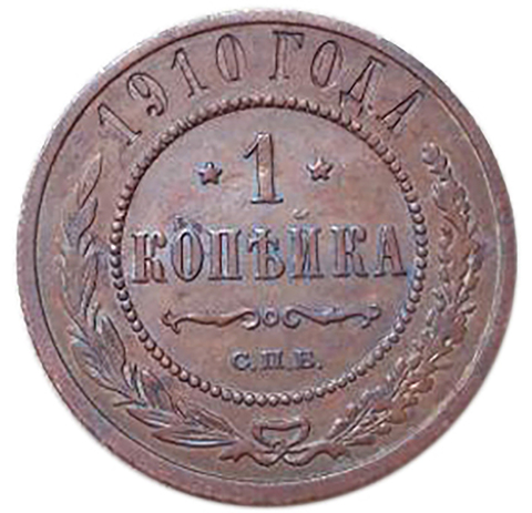 Реверс: вверху вдоль края монеты обозначение год выпуска «1910 ГОДА» ниже слева вдоль края монеты лавровая ветвь, справа дубовая, внизу ветви соединяются и перевязаны лентой, в середине в ободке из точек обрамленный слева и справа звездочками номинал монеты - цифра «1», ниже слово «КОПЕЙКА», под ним две направленные в разные стороны фигурные черты, ниже обозначение монетного двора «СПБ».