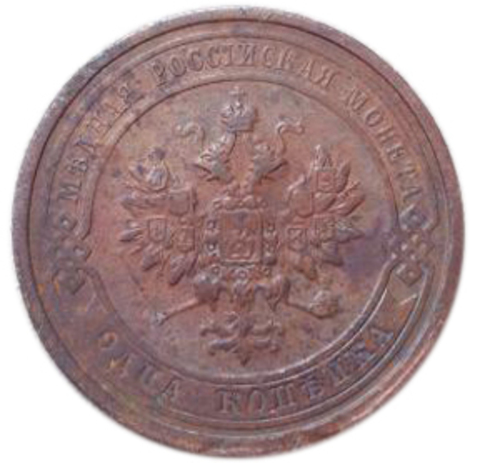 Аверс: вверху вдоль края монеты в выделенной выступающей рамкой полосе надпись «МЕДНАЯ РОССИЙСКАЯ МОНЕТА», внизу вдоль края монеты в выступающей рамке, соединённой с верхней рамкой расположенными слева и справа фигурными решетками, на выступающей плашке вдавленными буквами обозначение номинала монеты «ОДНА КОПЕЙКА», в середине Малый Государственный Герб Российской империи.