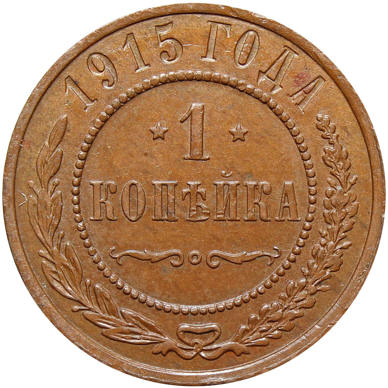 Реверс: вверху вдоль края монеты обозначение год выпуска «1915 ГОДА» ниже слева вдоль края монеты лавровая ветвь, справа дубовая, внизу ветви соединяются и перевязаны лентой, в середине в ободке из точек обрамленный слева и справа звездочками номинал монеты - цифра «1», ниже слово «КОПЕЙКА», под ним две направленные в разные стороны фигурные черты.