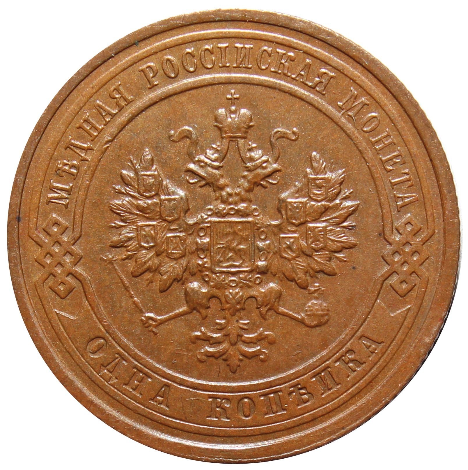 Аверс: вверху вдоль края монеты в выделенной выступающей рамкой полосе надпись «МЕДНАЯ РОССИЙСКАЯ МОНЕТА», внизу вдоль края монеты в выступающей рамке, соединённой с верхней рамкой расположенными слева и справа фигурными решетками, на выступающей плашке вдавленными буквами обозначение номинала монеты «ОДНА КОПЕЙКА», в середине Малый Государственный Герб Российской империи.
