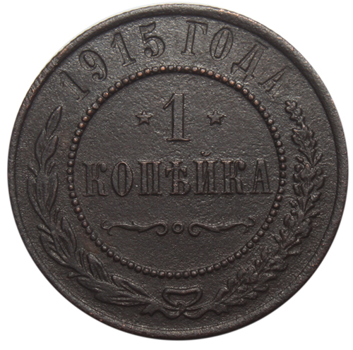 Реверс: вверху вдоль края монеты обозначение год выпуска «1915 ГОДА» ниже слева вдоль края монеты лавровая ветвь, справа дубовая, внизу ветви соединяются и перевязаны лентой, в середине в ободке из точек обрамленный слева и справа звездочками номинал монеты - цифра «1», ниже слово «КОПЕЙКА», под ним две направленные в разные стороны фигурные черты.
