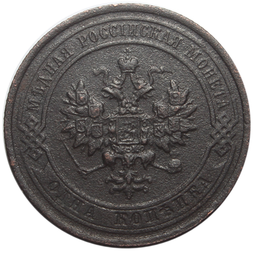 Аверс: вверху вдоль края монеты в выделенной выступающей рамкой полосе надпись «МЕДНАЯ РОССИЙСКАЯ МОНЕТА», внизу вдоль края монеты в выступающей рамке, соединённой с верхней рамкой расположенными слева и справа фигурными решетками, на выступающей плашке вдавленными буквами обозначение номинала монеты «ОДНА КОПЕЙКА», в середине Малый Государственный Герб Российской империи.