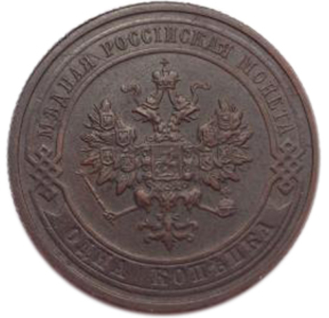 Аверс: вверху вдоль края монеты в выделенной выступающей рамкой полосе надпись «МЕДНАЯ РОССИЙСКАЯ МОНЕТА», внизу вдоль края монеты в выступающей рамке, соединённой с верхней рамкой расположенными слева и справа фигурными решетками, на выступающей плашке вдавленными буквами обозначение номинала монеты «ОДНА КОПЕЙКА», в середине Малый Государственный Герб Российской империи.