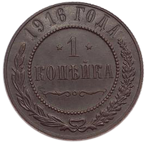 Реверс: вверху вдоль края монеты обозначение год выпуска «1916 ГОДА» ниже слева вдоль края монеты лавровая ветвь, справа дубовая, внизу ветви соединяются и перевязаны лентой, в середине в ободке из точек обрамленный слева и справа звездочками номинал монеты - цифра «1», ниже слово «КОПЕЙКА», под ним две направленные в разные стороны фигурные черты.