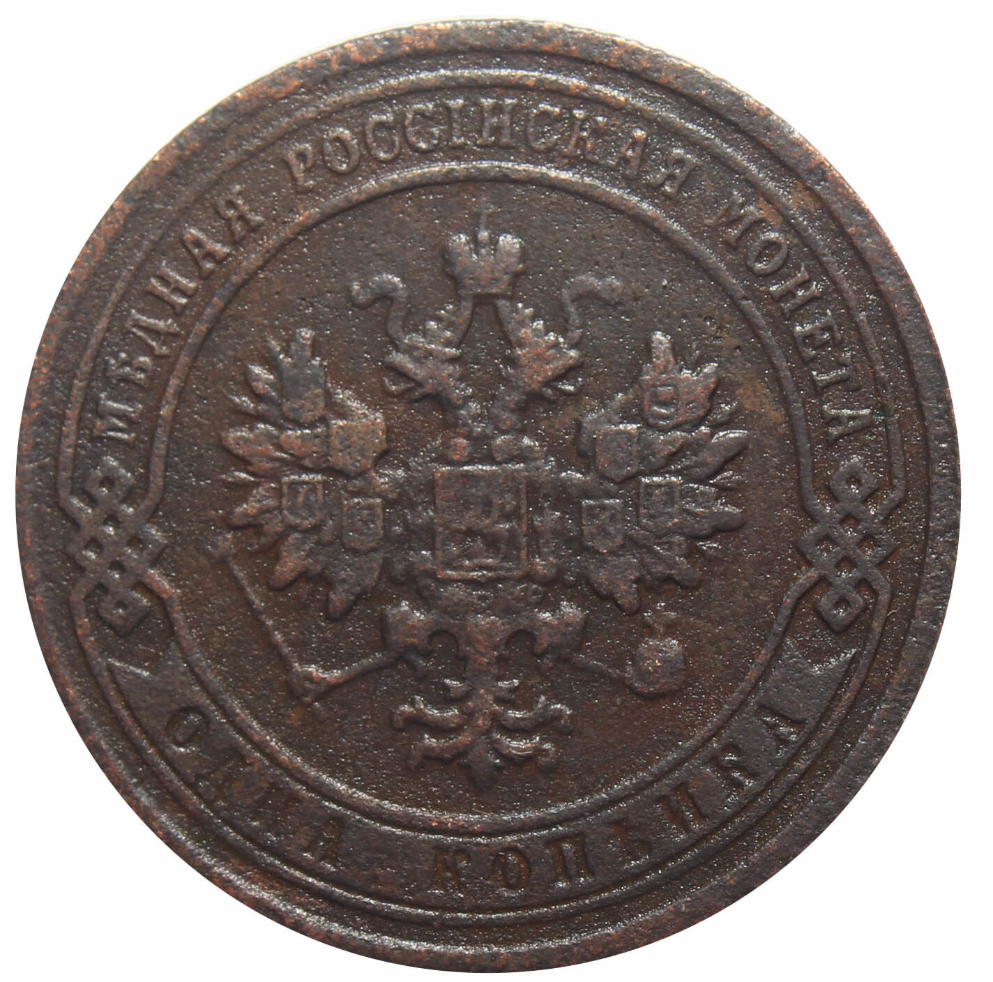 Аверс: вверху вдоль края монеты в выделенной выступающей рамкой полосе надпись «МЕДНАЯ РОССИЙСКАЯ МОНЕТА», внизу вдоль края монеты в выступающей рамке, соединённой с верхней рамкой расположенными слева и справа фигурными решетками, на выступающей плашке вдавленными буквами обозначение номинала монеты «ОДНА КОПЕЙКА», в середине Малый Государственный Герб Российской империи.