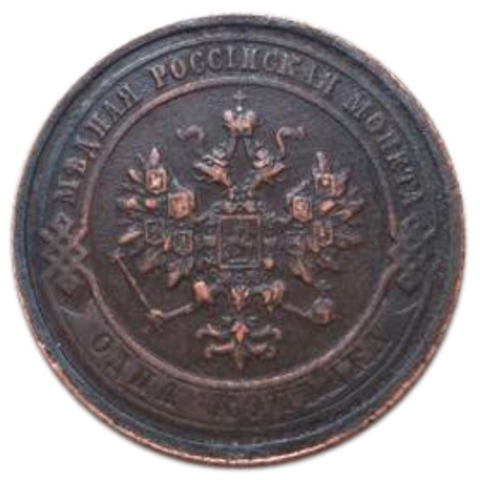 Реверс: вверху вдоль края монеты обозначение год выпуска «1908 ГОДА» ниже слева вдоль края монеты лавровая ветвь, справа дубовая, внизу ветви соединяются и перевязаны лентой, в середине в ободке из точек обрамленный слева и справа звездочками номинал монеты - цифра «1», ниже слово «КОПЕЙКА», под ним две направленные в разные стороны фигурные черты, ниже обозначение монетного двора «СПБ».